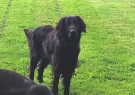 Red loves everyone, plays with everyone, and I swear has a permanent smile on his very handsome face, he's got a lovely head (I'm a bit obsessed with flatty heads!), the fur on his ears tends to flip out at the ends which is slightly comical but sweet. He loves Charlie but will sleep with any one of the girls, I suspect Reiker thinks he's a bit daft and gets a touch grumpy with him sometimes but on the whole they get along well and Red is very respectful. I'm not sure he's a great thinker, I suspect he just can't be bothered unless food is the goal, but he's biddable and nice to be around and like all flatties has no respect for personal space. He's not barky but is quite vocal if your not fast enough with lunch, dinner is his fav time of day I reckon. He prefers to be outside most of the day just lying around under the truck when it's warm and then comes in and takes up most of the rug of an evening. He is actually a touch taller than Reiker but a slightly slimmer build, still a nice size boy, he carries liver from his sire and his mum was a sweet natured girl who was very pretty. We look forward to welcoming some puppies from him in 2026.